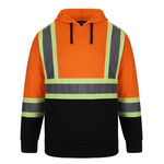 280 gsm – 8.3 oz./yd2 – 14 oz./lin. yd 100% polyester one side brushed fleece with anti-pill and abrasion resistant finishes.  Adjustable drawcord in hood. Kangaroo pocket with concealed cellphone pocket.  4” hi-vis contrast band with 2” reflective tape on front and back body and sleeves.  Meets CSA standards.